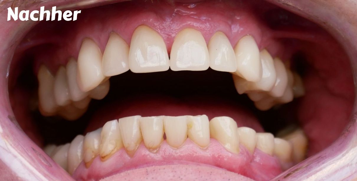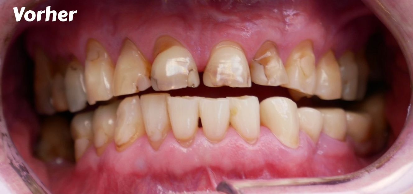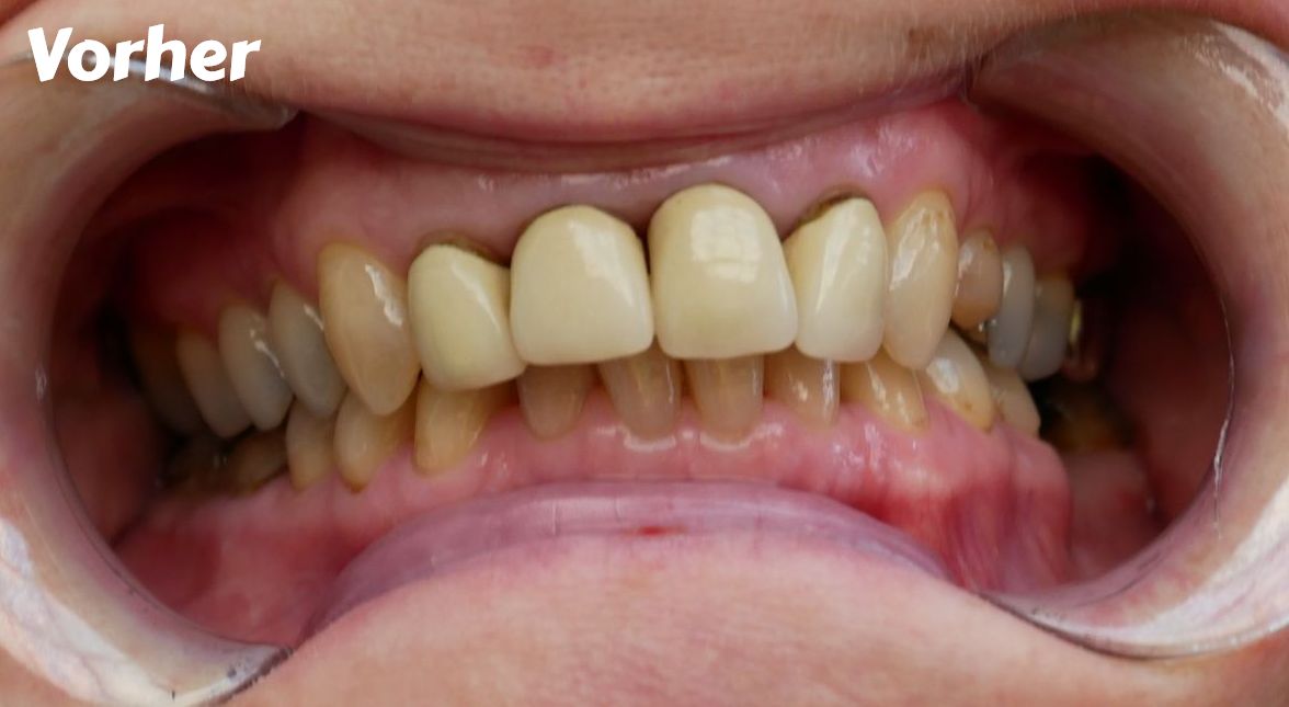 Die Kronen an den mittleren Schneidezähnen sind nicht mehr randschlüssig, das Zahnfleisch bereits zurückgegangen.